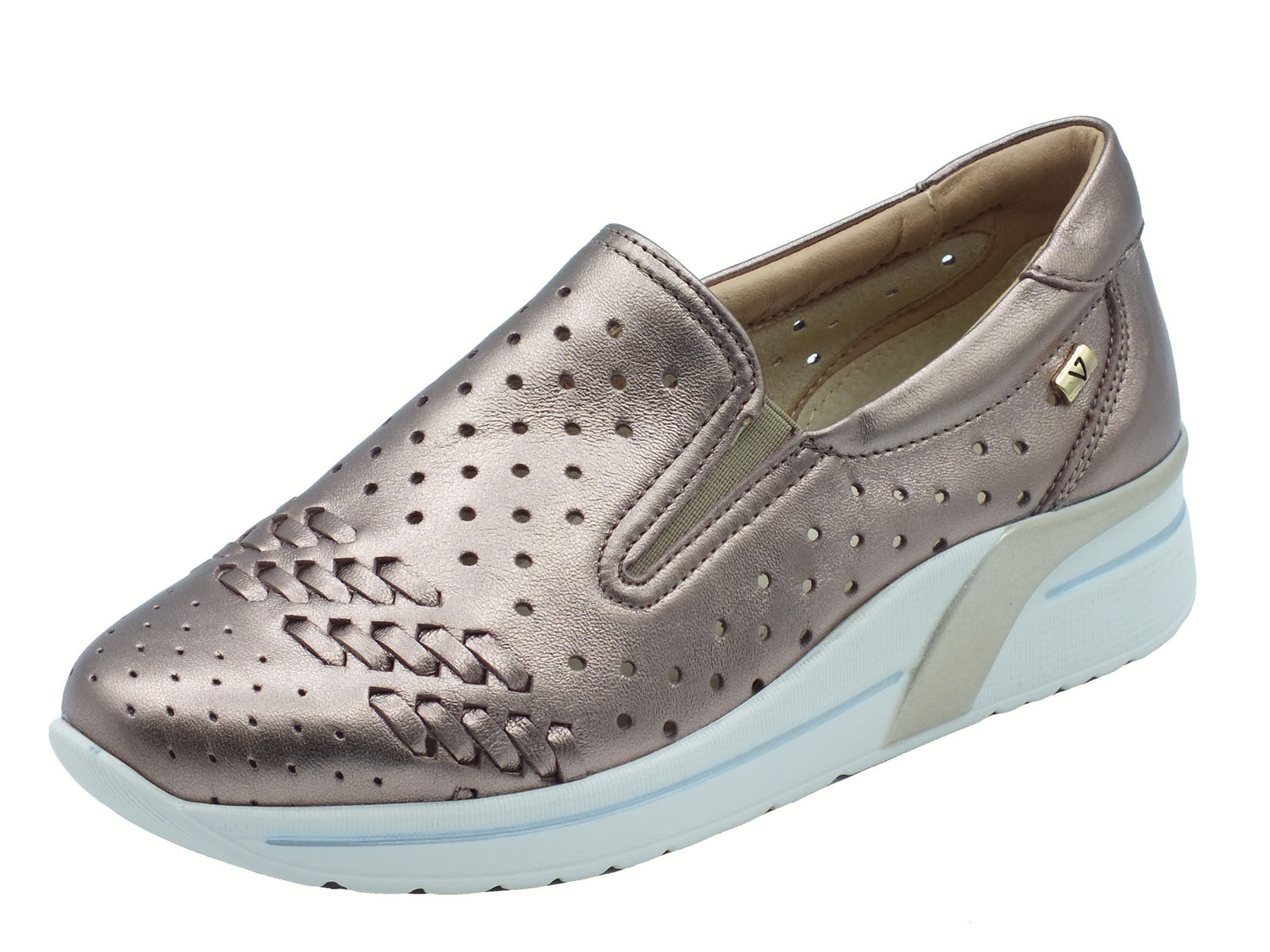 V49402 vitello bronzo mocassini con zeppa per donna in pelle traforata