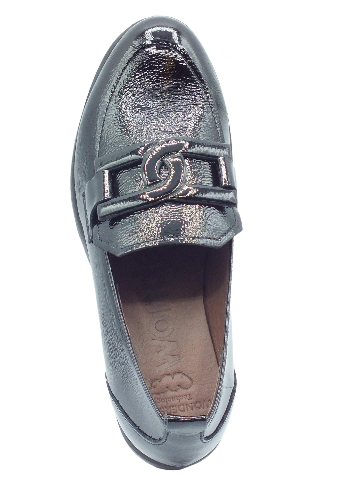 C-33303 iris negro mocassini per donna in pelle verniciata con zeppa alta