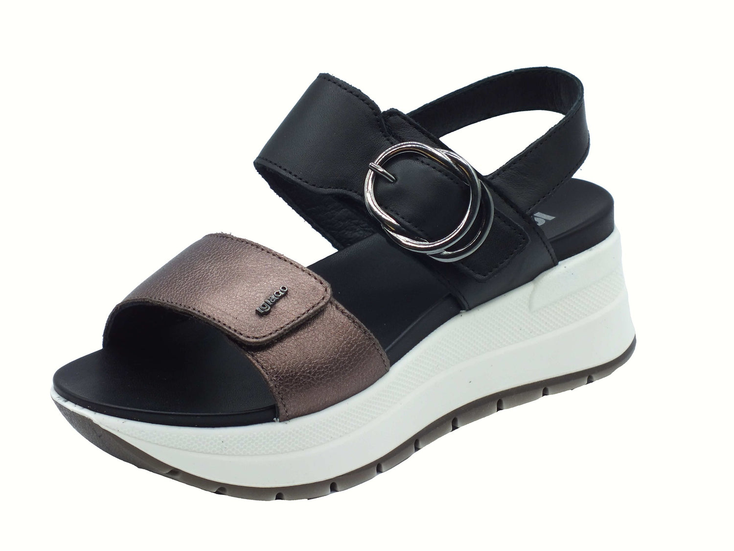 7677622 nappa nero bronzo sandali per donna in pelle con zeppa alta doppio strappo