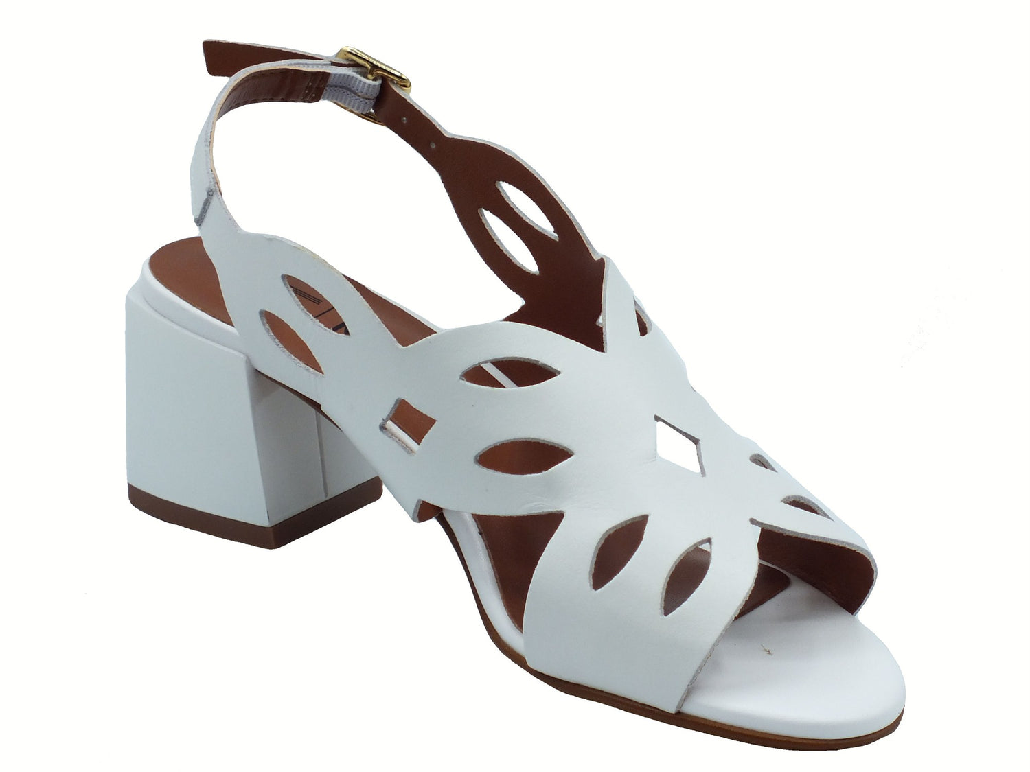 K35507z bianco sandali per donna in pelle laserata con tacco medio e fibbietta