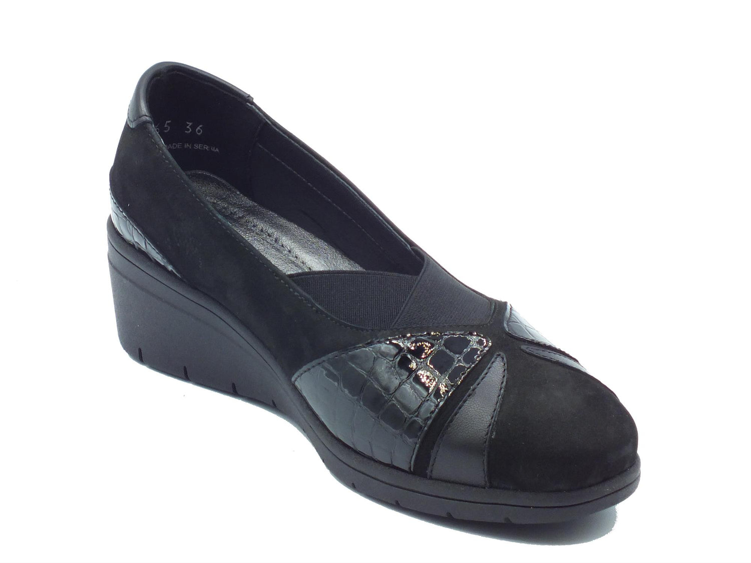 K91633 nabuk nero mocassini comfort per donna in nabuk con zeppa alta