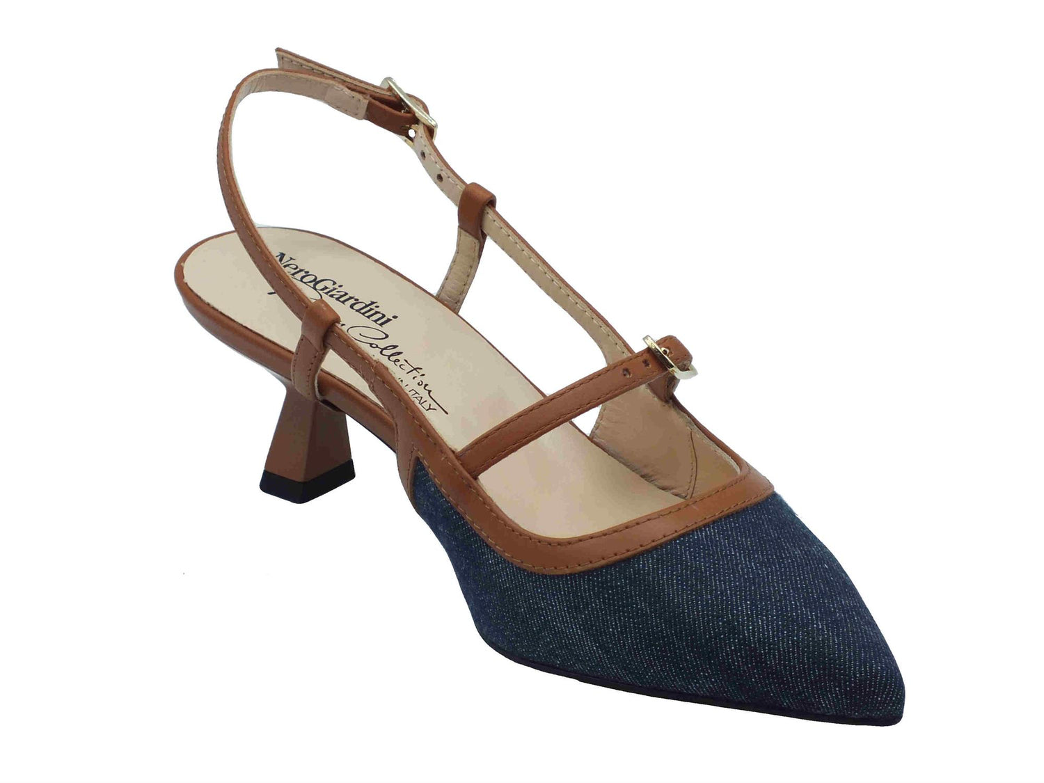 Nerogiardini e512254de jeans cognac decoltè eleganti per donna con doppio cinturino e tacco basso