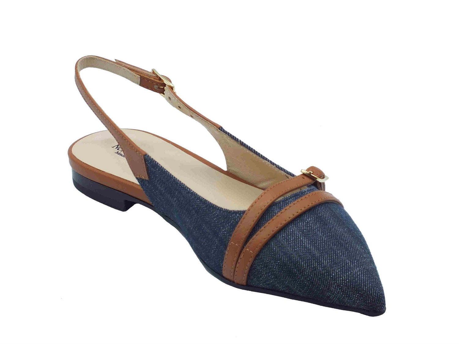 Nerogiardini e512362d jeans cognac sandali a punta eleganti per donna con cinturino e tacco basso