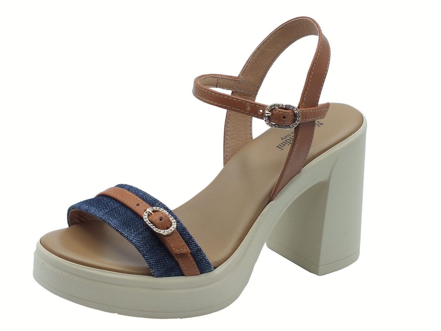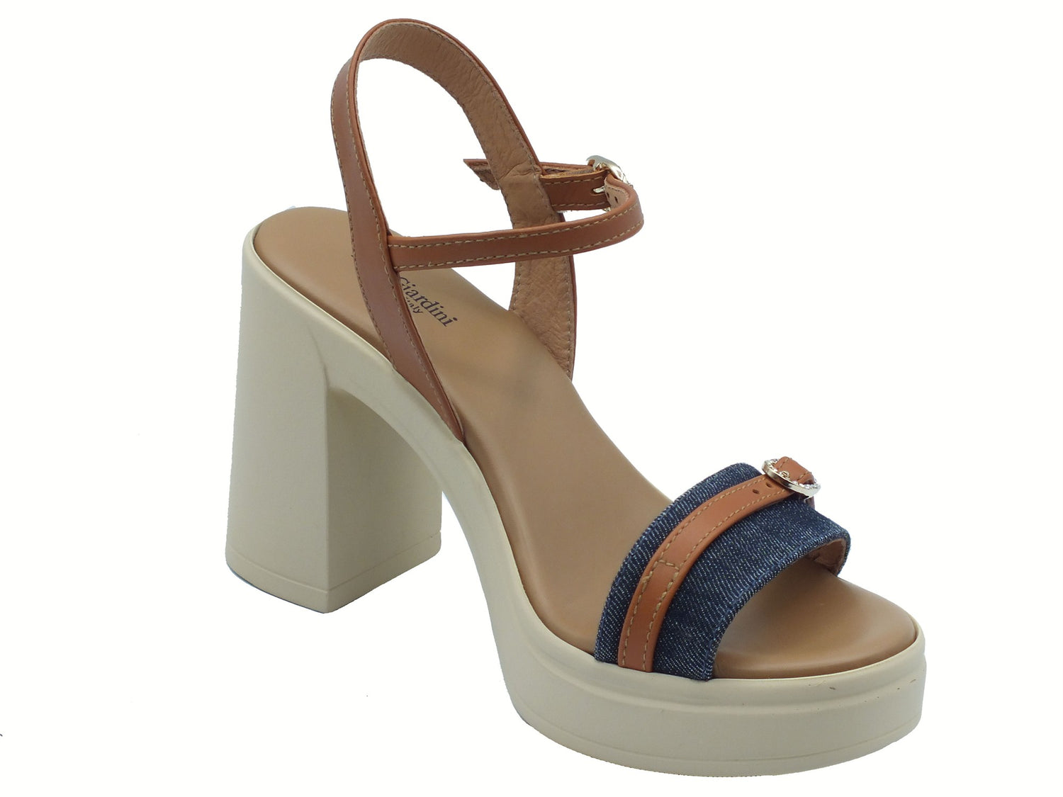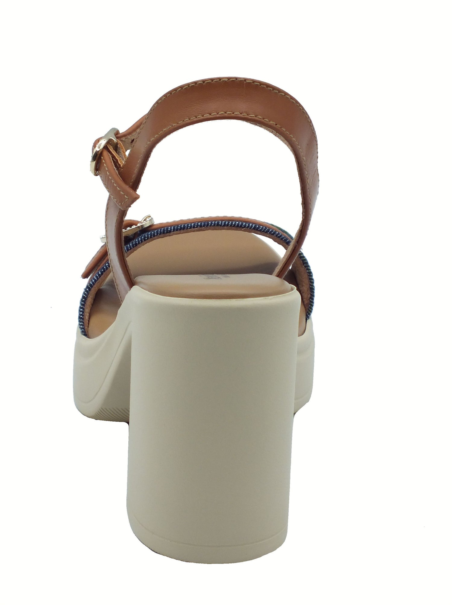 Nerogiardini e513665d tinto jeans cognac sandali per donna in pelle con fibietta e tacco alto